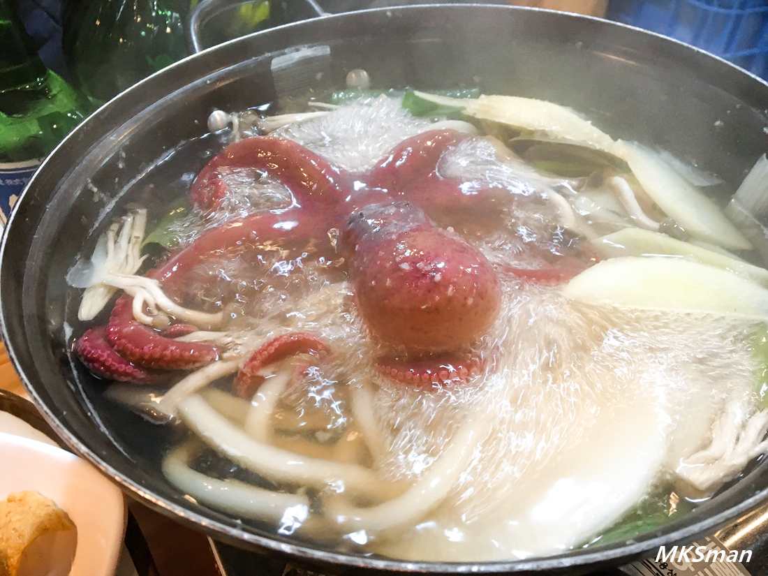 문어탕도 서비스로 나오고 살아있는 문어가 어찌나 신선하더군요. 뚜껑을 닫아도 뛰쳐 나올려고 하더군요. 살짝 데친 뒤 먹기 좋은 크기로 잘라줘야죠. 문어는 너무 익히면 질겨 질 수 있으니 살짝 데쳐 먹으면 식감도 좋고 부드럽게 넘어 간답니다. 문어탕의 국물도 정말 제대로입니다. 술을 마시지만 문어탕의 국물이 바로 해장시켜 주더군요.