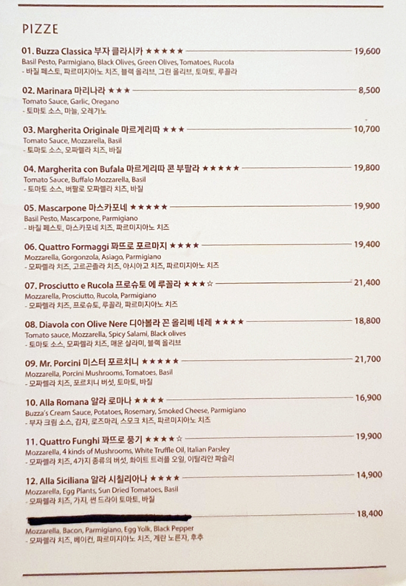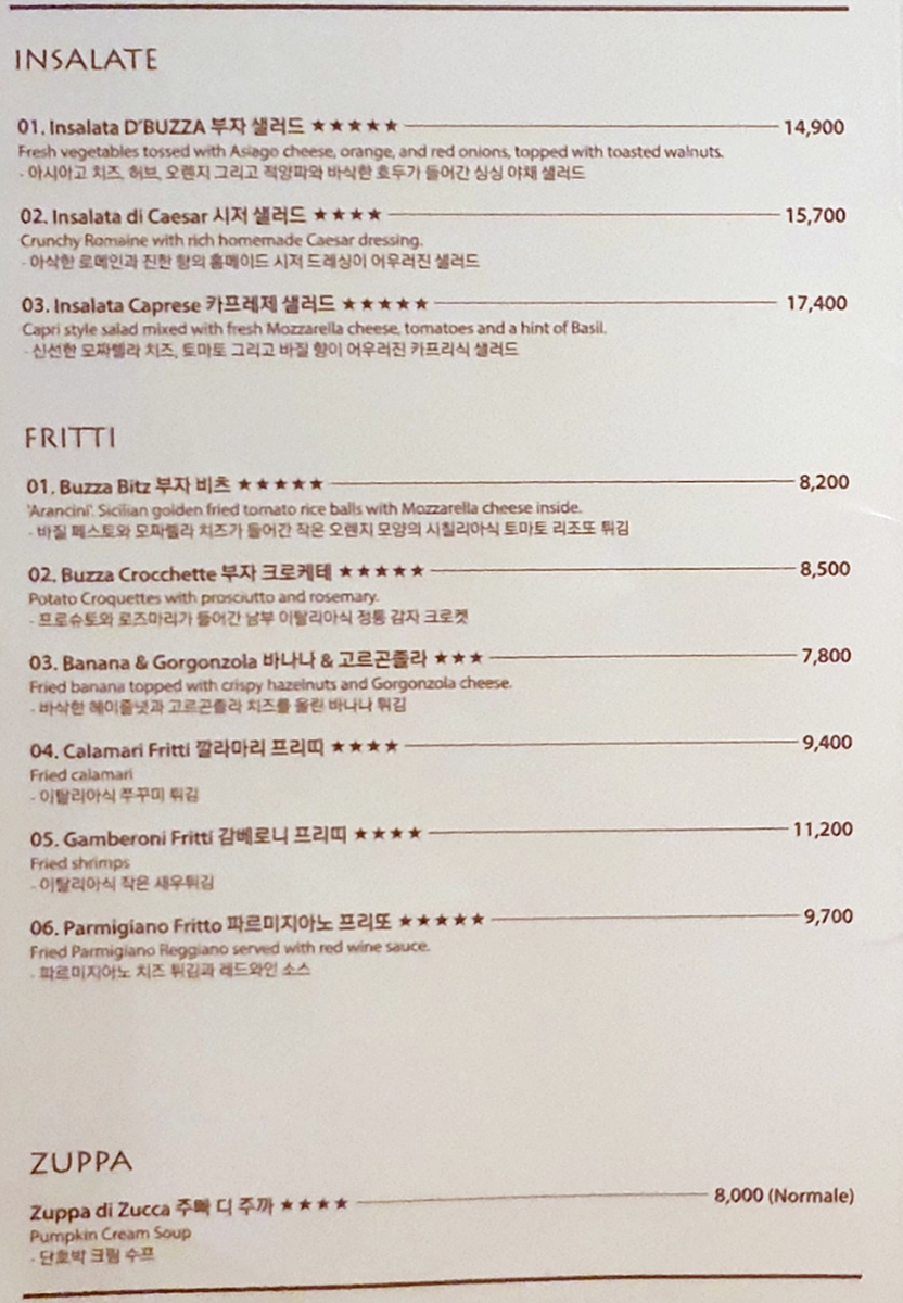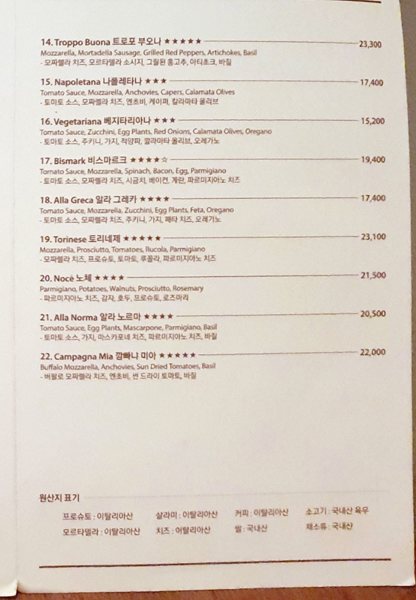 메뉴는 정말 다양합니다. 사진으로 알아보기 쉽게 되어 있다면 더 좋을거 같다는 생각이 드네요. 이태리 음식에 친숙하지 않다면 추천해달라고 하면 되겠네요.