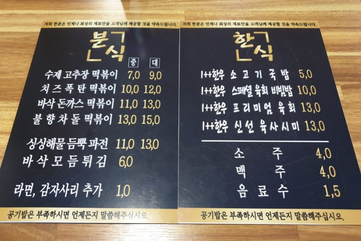 한분이라 해서 한분에게만 저렴한 가격으로 베푸는 게 아닌 한식과 분식의 퓨전음식점이라 한분이라는 이름이 지어졌습니다. 저렴한 한우 소고기 국밥만 유명한 것이 아니라 한우 육회나 육회비빔밥, 사시미와 함께 떡볶이, 튀김 같은 분식류도 함께 먹을 수 있어 더 유명한 곳입니다.